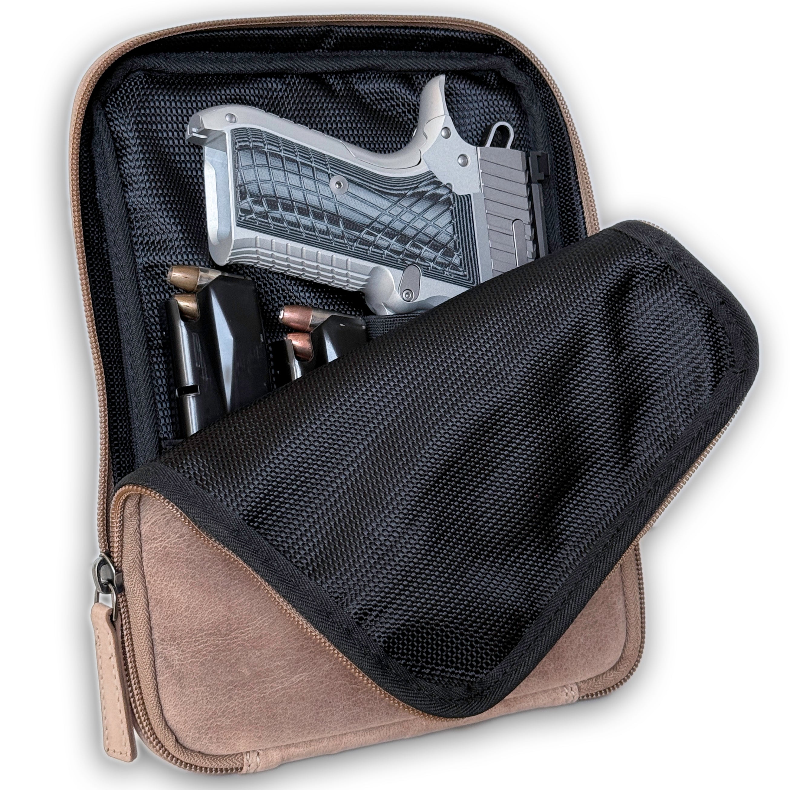 Main Zippered Compartment: Expertly designed to accommodate any pistol up to 8" long and 6" tall, along with magazines.